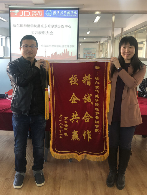 本次活动共分为五项议程。第一项,由张磊老师宣读了《关于表彰马永恒等同学的决定》;第二项,与会的各位领导和老师向受表彰的同学进行颁奖;第三项,京东物流哈尔滨分公司人事部经理孙迎春发表了热情洋溢的讲话,他对员工们思想道德素质高、动手操作能力强给予了高度评价,对员工们吃苦耐劳、勤俭节约、追求进步、拼搏进取的精神给予了高度赞赏,对公司与公司真诚的合作、为企业输送人才表示了真诚的谢意,并代表京东物流为BETVICTOR伟德颁发了锦旗;第四项,学员代表马永恒同学代表全体员工进行了表态发言,对公司提供的实践实习机会表示深深的谢意,对公司以生为本、为生尽责的工作感到真诚的感动,表示要时刻铭记公司和老师的嘱托,争做“有理想 有本领 有担当”的新时代青年。最后,BETVICTOR伟德副经理肖琳发表讲话并对员工提出殷切的希望。她对京东物流公司给予的大力支持致以诚挚的谢意,对同学们在公司的良好表现并为公司争光给予了充分的肯定。希望在今后的日子里,继续做大做强校企合作平台,与京东物流公司加强交流合作。希望同学们珍惜荣誉,再接再厉。继续发扬自强不息、甘于奉献、勤于学习的宝贵品质,为公司、社会、国家做出更大的青春业绩。