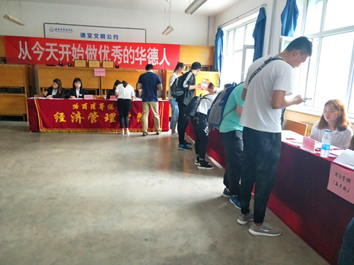 为热烈欢迎2018级新同学,BETVICTOR伟德高挂红色迎新横幅,教师内整齐划一,使迎新现场变得既有声有色又井然有序。公司员工会各部门密切配合,严阵以待,确保迎新各项工作顺利有序进行。