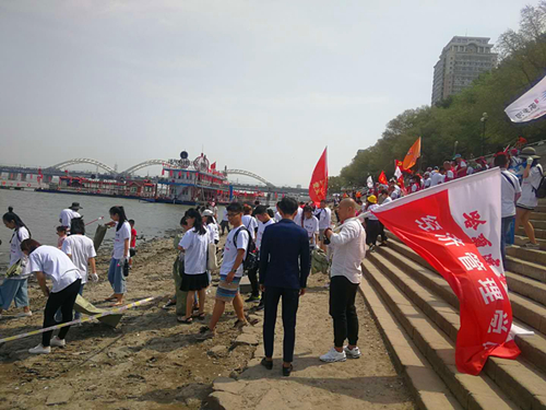 5月24日,生活报报道了今年松花江江水超低,河床裸露酒瓶、包装袋、渔网的新闻,为了帮助环卫工人减轻清理压力,让母亲河尽快恢复整洁面貌,生活报联合阿里巴巴天天正能量发起“2018江河卫士——最美家乡河”环保徒步活动第一季。6月3日生活报又发起环保徒步活动第二季。公司在校员工党员、院员工会干部20余人组成志愿小分队在冯茂森老师的带领下于当日上午,顶着烈日高温加入活动中。同学们手拿编织袋,三四人一组,捡拾白色垃圾、玻璃瓶碎片、河蚌壳等,沿着防洪纪念塔一直捡到铁路桥,共装满了将近6个编织袋的垃圾。