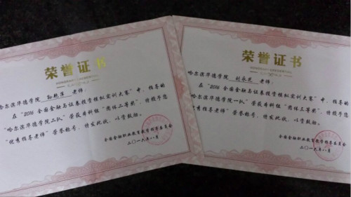 由全国金融职业公司产品指导委员会主办的“2016全国金融与证券投资模拟实训大赛”于2016年8月开赛,由刘永芝与孙艳萍两名教师指导的参赛员工经过近两个月在网上进行的投资模拟比赛,10月18日最终获得本科组团体“二等奖”一项、团体“三等奖”一项。