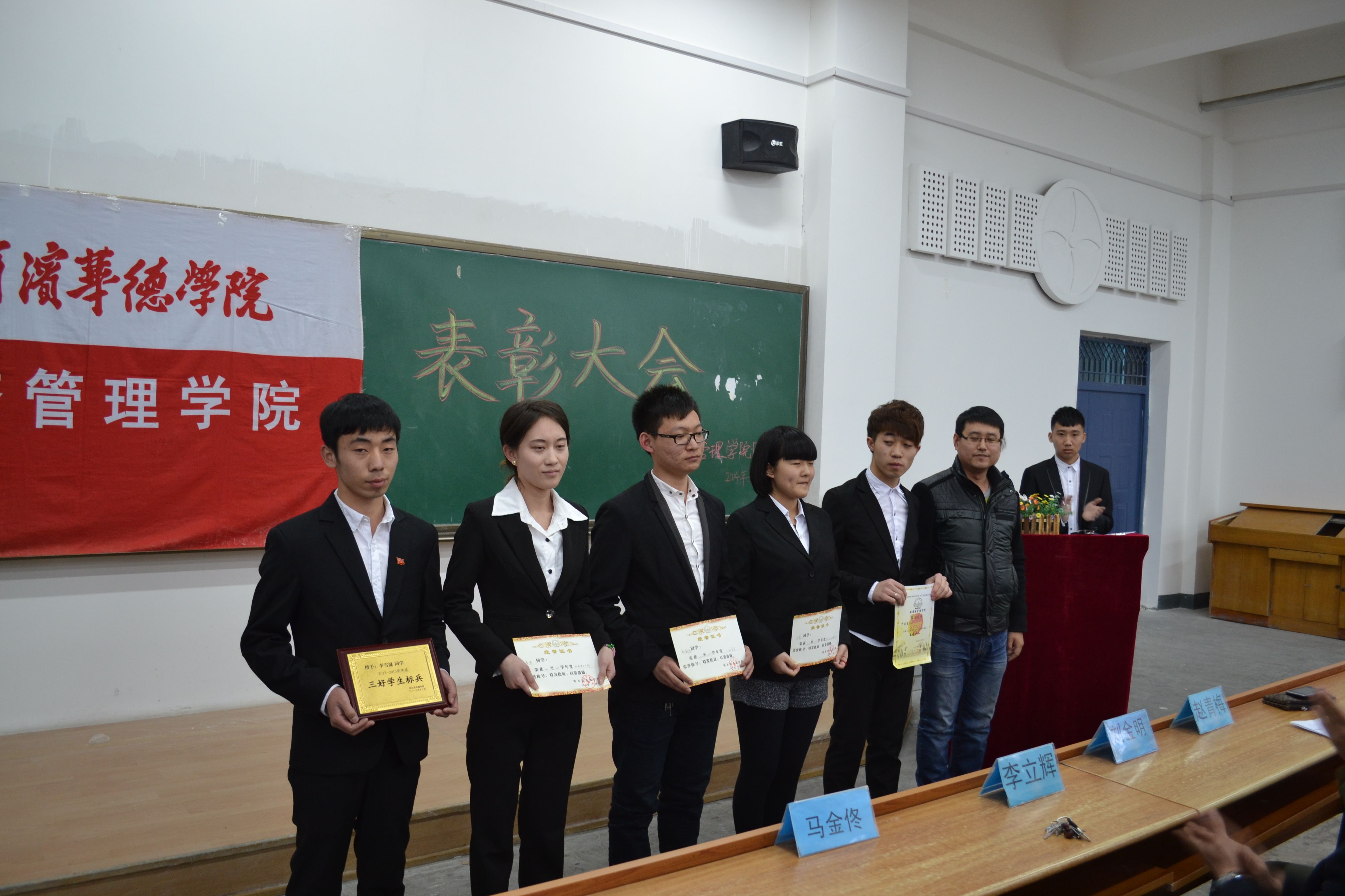 此次会议共分为四项内容,第一项由赵青梅老师宣布表彰大会正式开始并宣读获奖名单;第二项为颁奖环节,由到场老师为获得“优秀员工干部标兵”、“先进个人”等奖项的同学颁奖;第三项由三好员工标兵获得者李雪健同学、优秀团干部标兵获得者董丽媛同学代表获奖同学发言;第四项由副经理刘金明为此次大会做总结,他充分肯定了上学年度经管公司取得的成绩,并结合本学期公司学风建设的重要内容对同学们提出了新的希望和要求。