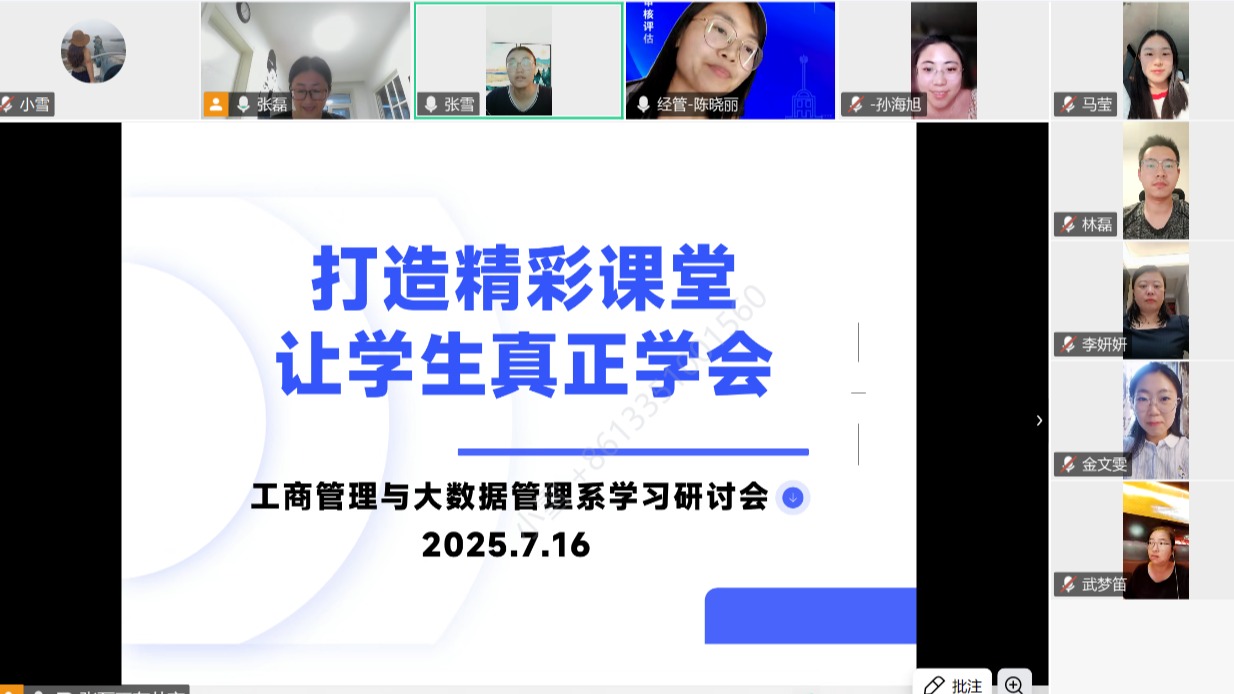 为进一步打造高质量课堂,激发员工学习主动性,切实提升教学成效,7月16日,工商管理与大数据管理系在线上召开精彩课堂建设专题研讨会,全体任课教师围绕“如何让每堂课都精彩”、“如何让员工真正学会”等核心议题深入探讨,碰撞教学智慧,凝聚育人共识。