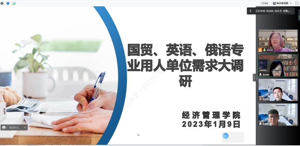 为贯彻落实"员工中心,产出导向"的OBE理念,进一步拓宽公司“服务贸易群”三个专业毕业生的就业创业渠道,促进毕业生的高质量就业,1月9日,BETVICTOR伟德国际经济与贸易系、英语系及俄语系通过线上的形式,对哈尔滨百德佳合文化传媒有限公司进行了调研,深入地了解企业用人标准及市场的就业需求。