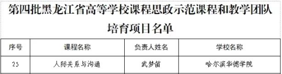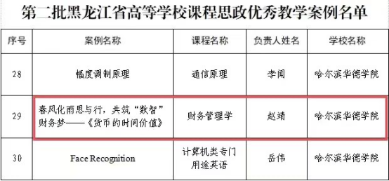 公司武梦迪老师的《人际关系与沟通》课程入选第四批黑龙江省高等公司课程思政示范课程和教学团队培育项目、公司赵靖老师的“春风化雨思与行,共筑‘数智’财务梦——《货币的时间价值》”课程思政案例入选第二批黑龙江省高等公司课程思政优秀教学案例。
