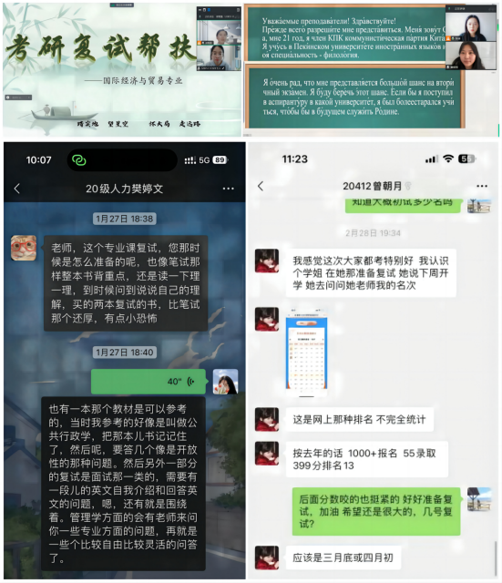 帮扶工作开始前,辅导员老师更新员工考研成绩信息,统计超过国家线的员工名单并召开考研复试动员大会,为接下来的帮扶工作做好充分的调动与鼓励。随后,各系开展多样化帮扶活动。首先,建立考研复试员工微信群,在群内分享学习资料与历届考研成功案例来鼓励员工积极学习复试科目,并及时解答员工备考中遇到的各种问题。其次,从历年考研真题入手,针对不同学习程度的员工进行试题内容的分析指导,并适当补充优质的在线学习资源以供参考。第三,通过一对一的方式解答员工关于成绩单、学籍信息等复试材料准备的疑虑,并提醒员工复试通过后需在研招网上点击确认拟录取信息。第四,对初试分数不理想的员工进行心理疏导,并劝导员工切勿相信校外考研机构的保调剂广告,谨防受骗。