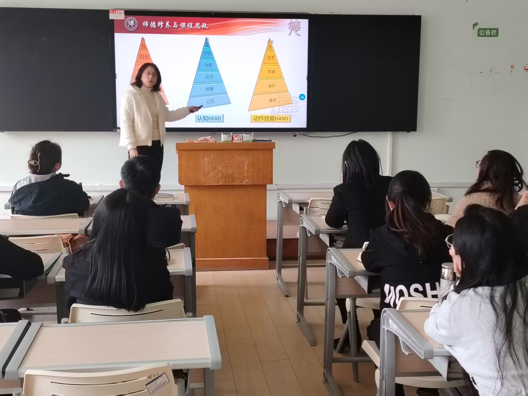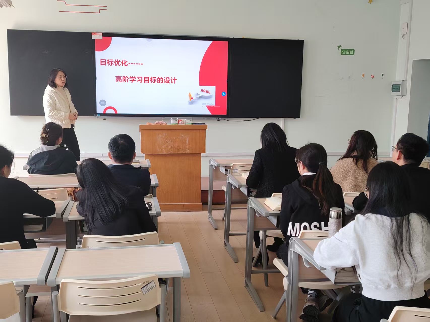 培训过程中,兰老师带领教师们一同回顾了BOPPPS教学模型的六大关键环节,着重指出课程目标对后续教学内容的设计以及实施成效有着直接且关键的影响。依据布鲁姆教育目标分类理论,向与会教师介绍了“3H”设计框架,倡导运用逆向设计的思维模式来设定教学目标,并展示了如何选用“分析”“设计”“评估”等具备可观测性的动词让教学目标真正具备可衡量性、可操作性以及可实践性。理论讲解后,参训教师按学科分组开展实践演练,轮流进行BOOOPS说课并互为点评,整个培训过程内容充实、形式多样、气氛活泼。
