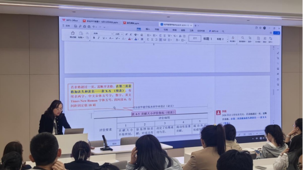 随后,李娟副经理围绕2026届毕业论文新版排版规范展开详细讲解。她从论文结构框架入手,逐一对封面信息填写规范、中英文摘要格式要求、目录生成标准、正文标题层级字体与字号规定、参考文献著录格式、图表编号与说明排版细节等内容进行了细致解读。同时,她结合以往论文排版中常见的格式错误案例,如页码标注混乱、引用格式不统一等问题,强调了新版规范中的新要求,帮助教师更直观地理解规范要点。